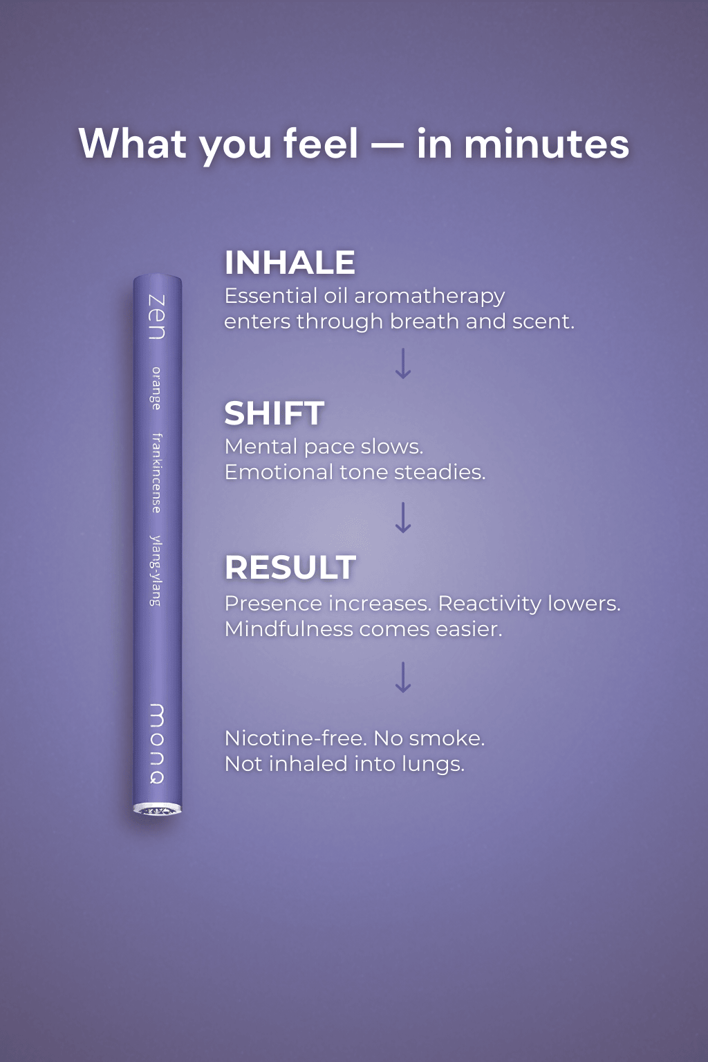 Zen MONQ is a portable, handheld diffuser that delivers a carefully crafted terpene-based aroma. Simply inhale through your mouth and exhale through your nose to enjoy the layered scents.