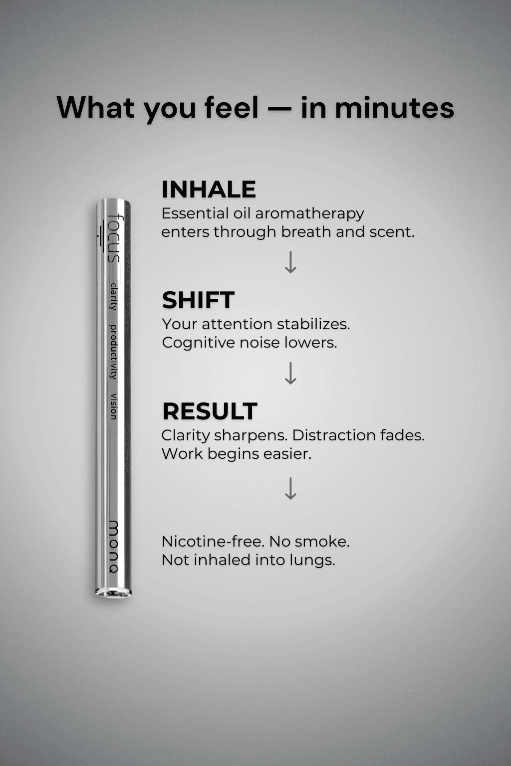 Focus MONQ is a portable handheld diffuser that delivers carefully blended terpene‑based aromatherapy. Simply breathe in through your mouth, and exhale through your nose for an approachable personal aromatherapy experience that’s easy to integrate into your day.