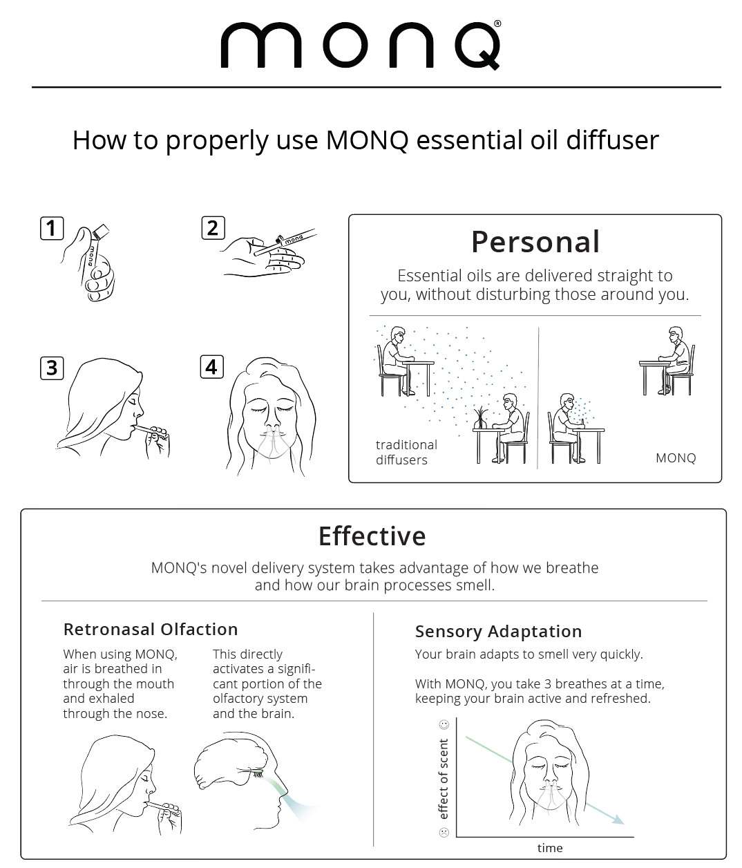 MONQ R was created to revolutionize the way you use aroatherapy—it’s rechargeable, reusable, responsible, and reinvented. There are lots of R’s in there, so MONQ R just seemed to fit!