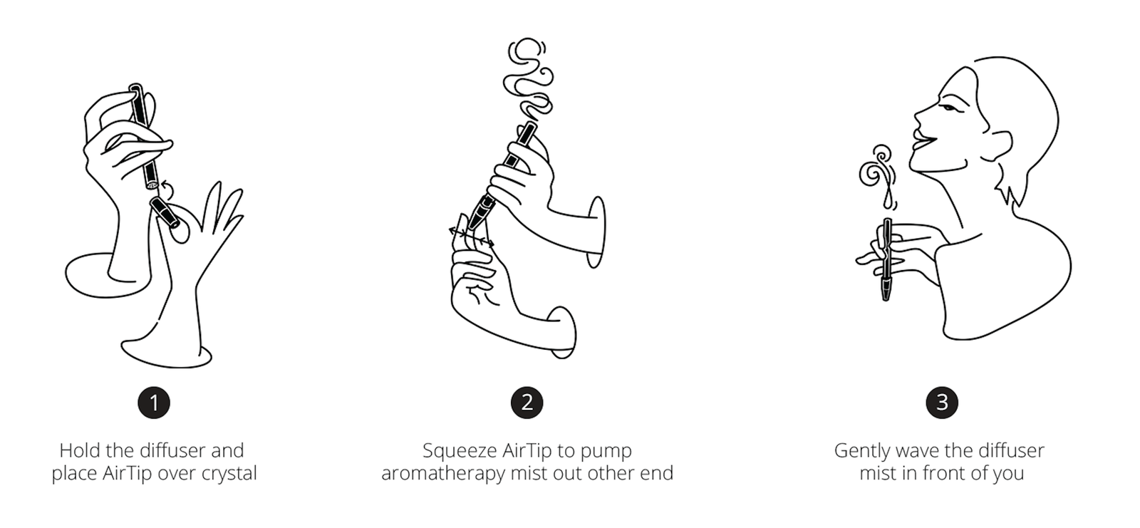 The AirTip™ Standard Method uses a portable, hand-held device that provides a small puff of air directly from the diffuser. As the crystal lights up, the mist is expelled from the tip allowing you to enjoy MONQ Air as you breathe.